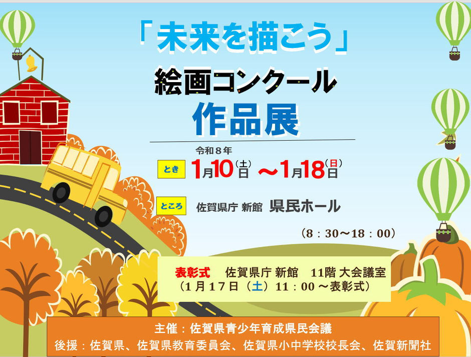 佐賀県青少年育成県民会議では、こどもたちが抱いている「夢」を絵に描き、家族をはじめ友人・知人に表現することで、夢に向かって頑張る姿勢を培い、こどもたちの健全な育成に役立てるため「未来を描こう」絵画コンクールを毎年実施しています。