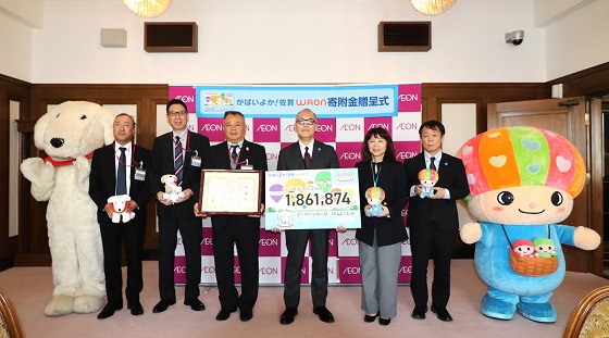 令和7年4月23日(水)に、イオン株式会社様から佐賀県に、186万1,874円が寄付されました。イオン株式会社様と佐賀県は、平成24年7月23日に包括協定を締結し、電子マネー「がばいよか!佐賀WAON(ワオン)」カードの利用金額の0.1%が寄付されることとなっています。相互に緊密な連携を図ることにより、双方の資源を有効に活用した協働による活動を推進し、佐賀県の更なる地域活性化及び県民サービスの向上に取り組んで参ります。