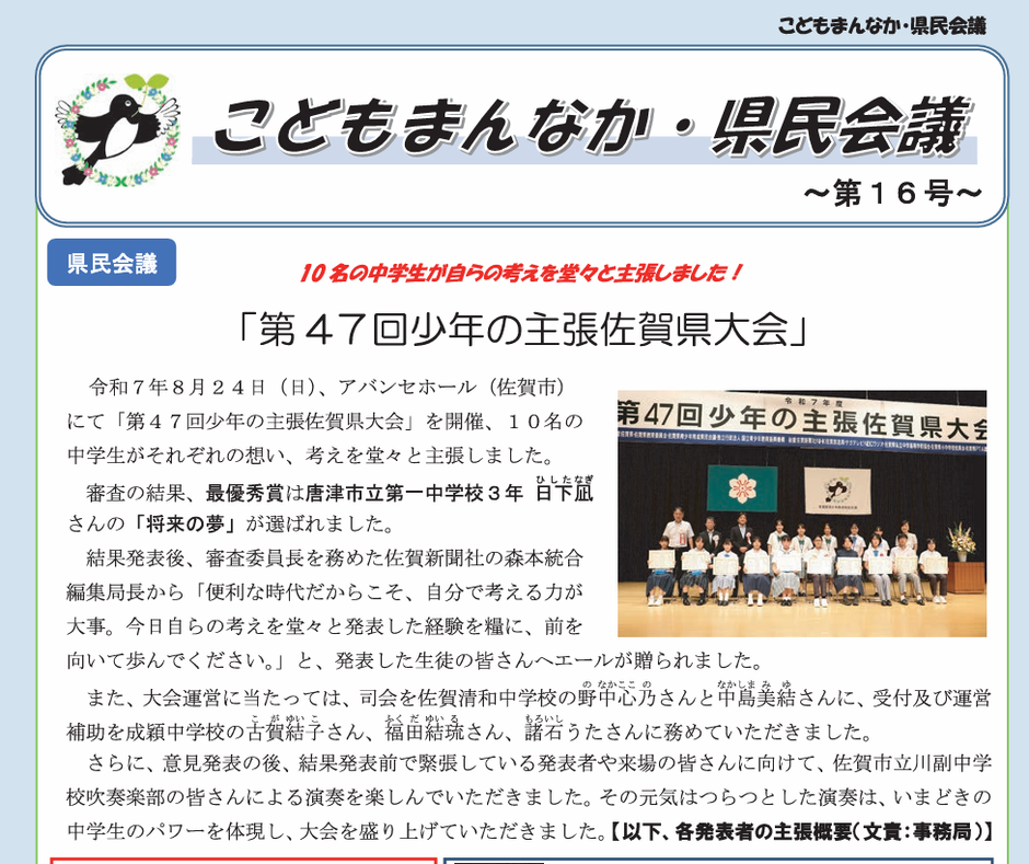 今回は「第47回少年の主張 佐賀県大会」で発表された10名の生徒さんの主張概要及び、賞ごとに掲載しています。